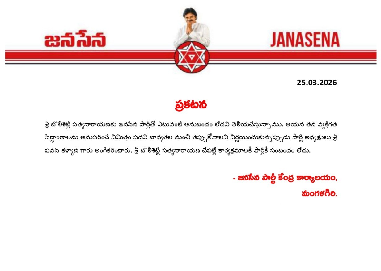 బొలిశెట్టికి జనసేన షాక్...! పార్టీతో అయనకు ఎలాంటి అనుబంధం లేదన్న జనసేన..!