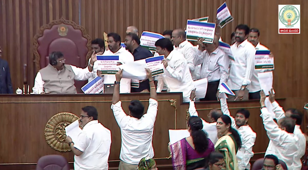 అసెంబ్లీ సమావేశాలకు వైసీపీ హజరు.... ప్రభుత్వానికి వ్యతిరేకంగా నినాదాలు చేస్తూ సభలోకి వచ్చిన వైసీపీ సభ్యులు ప్రతిపక్ష హోదా ఇవ్వాలంటూ డిమాండ్ ....